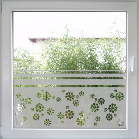 Vorhänge und Rollos sind eine Möglichkeit, gut einsehbare Fensterflächen abzuschirmen. Allerdings versperren diese Varianten auch viel warmem Sonnenlicht den Weg in Ihre Wohnung. Ein Windowtattoo gibt Ihnen deshalb die Möglichkeit, sich frei und unbeobachtet durch Ihr Zuhause zu bewegen, ohne auf natürliche Helligkeit verzichten zu müssen. Dazu deckt das Fenstertattoo PingPong den unteren Bereich Ihrer Fenster mit einem fröhlichen Blumenmuster ab und lässt im oberen Bereich viel freie Fensterfläche, durch die die Sonne hereinscheinen kann. Die sanft auslaufenden Streifen im oberen Rand schaffen dabei einen fließenden Übergang zur freien Glasfläche.